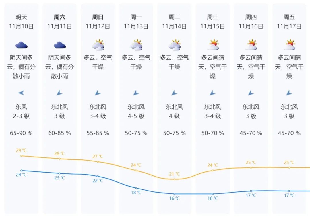 10日起受陆续南下的冷空气影响,气温逐日缓慢下降,其中10-12日间中有分散小雨,日温差小;