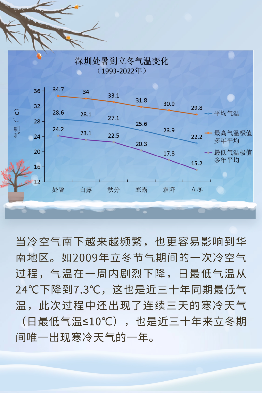 近三十年来立冬期间,深圳平均气温22.2℃,比霜降时降低1.7℃;最高气温极值多年平均29.8℃,比霜降时降低1.1℃;最低气温极值多年平均15.2℃,比霜降时降低2.6℃。