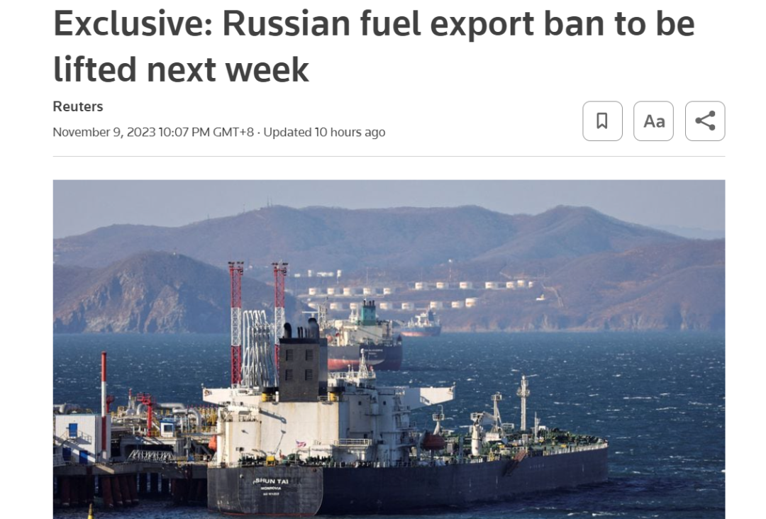 路透社称,俄罗斯是世界上最大的柴油出口国之一,于9月21日出台了一项燃油出口禁令,以解决国内燃油高价格和短缺问题。俄罗斯政府于10月6日放宽了限制,允许通过管道出口柴油,但保留了对汽油出口的限制措施。