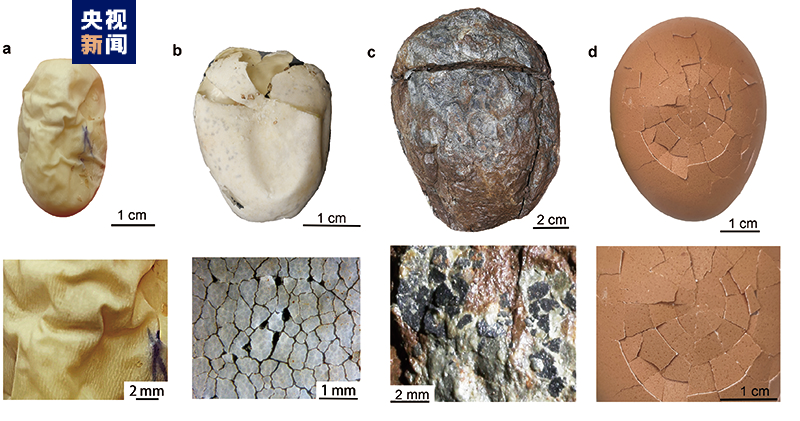 △黔龙蛋(c)与现生软壳蛋(a),革质蛋(b)和硬壳蛋(d)的对比