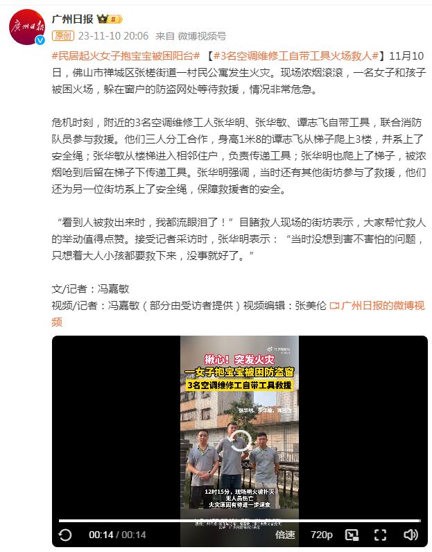 危机时刻,附近的3名空调维修工人张华明、张华敏、谭志飞自带工具,联合消防队员参与救援。他们三人分工合作,身高1米8的谭志飞从梯子爬上3楼,并系上了安全绳;张华敏从楼梯进入相邻住户,负责传递工具;张华明也爬上了梯子,被浓烟呛到后留在梯子下传递工具。张华明强调,当时还有其他街坊参与了救援,他们还为另一位街坊系上了安全绳,保障救援者的安全。