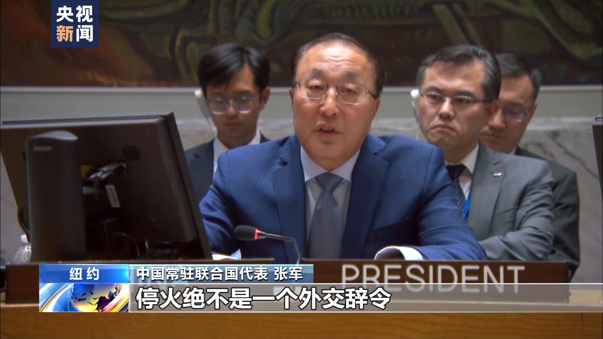 中国常驻联合国代表张军在发言中表示,加沙局势不仅仅是一场人道危机,更是人性危机,全世界必须共同大声疾呼:该打住了。面对这一切,安理会必须排除个别国家的阻挠干扰,立即采取负责任有意义的行动,坚守正义维护和平,停火止战刻不容缓。