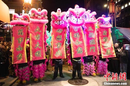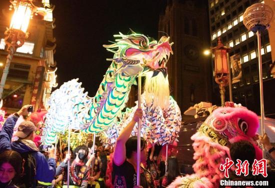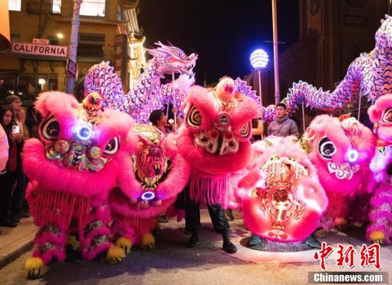 美国旧金山唐人街夜市上的舞龙舞狮表演吸引游客。