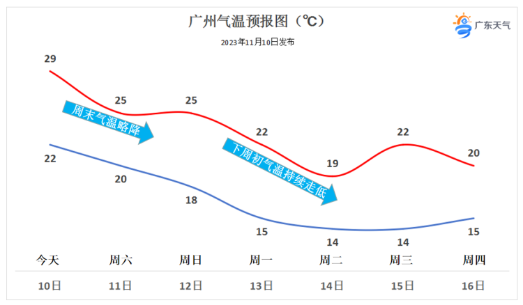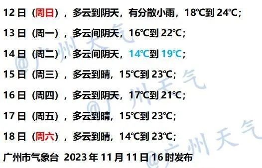 接下来两天,受冷空气持续影响,广州气温逐日下降,以多云为主,偶有零星小雨。下周二(14日)广州最高气温只有19℃,最低气温只有14℃。 虽然不是断崖式降温,不过这种阶梯式的降温,也能带来换季的感觉。