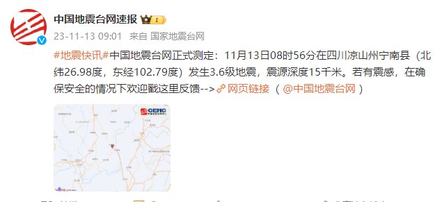 中国地震台网正式测定:11月13日08时56分在四川凉山州宁南县(北纬26.98度,东经102.79度)发生3.6级地震,震源深度15千米。