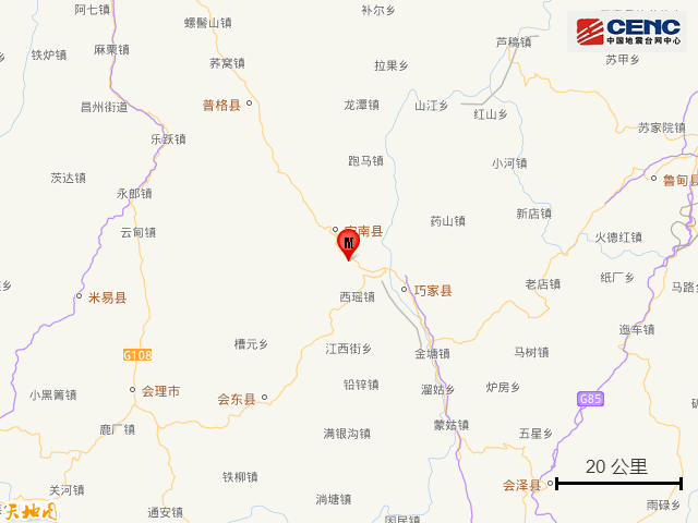 周边县城: 震中距宁南县10公里、距云南巧家县17公里、距会东县44公里、距普格县51公里、距会理市65公里,距云南昭通市100公里,距昆明市215公里。