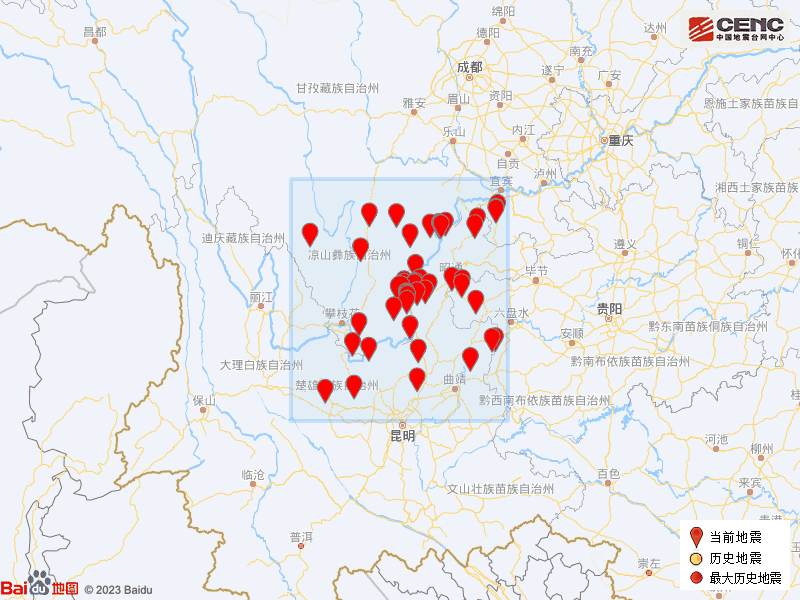历史地震: 根据中国地震台网速报目录,震中周边200公里内近5年来发生3级以上地震共62次,最大地震是2020年5月18日在云南昭通市巧家县发生的5.0级地震(距离本次震中43公里),按震级大小前50次历史地震分布如图。