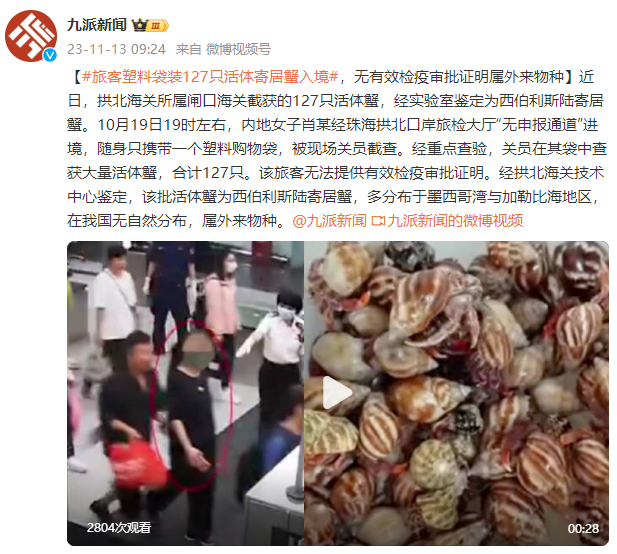 近日,拱北海关所属闸口海关截获的127只活体蟹,经实验室鉴定为西伯利斯陆寄居蟹。10月19日19时左右,内地女子肖某经珠海拱北口岸旅检大厅“无申报通道”进境,随身只携带一个塑料购物袋,被现场关员截查。经重点查验,关员在其袋中查获大量活体蟹,合计127只。该旅客无法提供有效检疫审批证明。经拱北海关技术中心鉴定,该批活体蟹为西伯利斯陆寄居蟹,多分布于墨西哥湾与加勒比海地区,在我国无自然分布,属外来物种。
