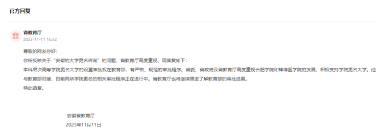 对此,11月11日,安徽省教育厅发布回复称,本科层次高等学院更名大学的设置审批权在教育部,有严格、规范的审批程序。