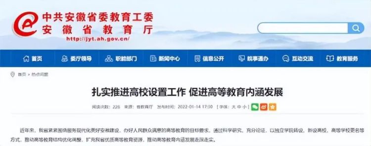 2022年1月,安徽省教育厅发布《扎实推进高校设置工作 促进高等教育内涵发展》。其中提到,已向教育部申请启动安徽公安学院新设,蚌埠医学院、合肥学院更名大学等工作。