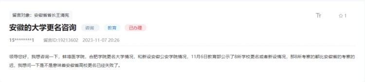 近日,有网友在领导留言板反映,2023年11月6日,教育部公示了8所学校的更名及新设情况。“我想咨询一下,蚌埠医学院、合肥学院更名大学情况,以及新设安徽公安学院情况。”上述8所学校均比安徽省的考察的迟,“这是不是意味着安徽省高校更名已经失败了?”