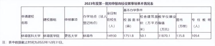 2023年2月,安徽省教育厅发布《关于2023年度第一批拟申报高校设置事项的公示》,对拟向教育部申报的蚌埠医学院更名蚌埠医科大学事项予以公示。