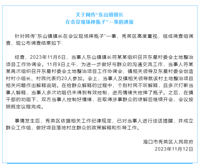 11月13日,“山海相约秀美英姿”微信公号发布海口市秀英区人民政府关于网传“东山镇镇长在会议现场摔瓶子”一事的通报。