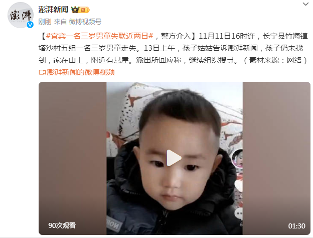 11月11日16时许,长宁县竹海镇塔沙村五组一名三岁男童走失。13日上午,孩子姑姑告诉澎湃新闻,孩子仍未找到,家在山上,附近有悬崖。派出所回应称,继续组织搜寻。