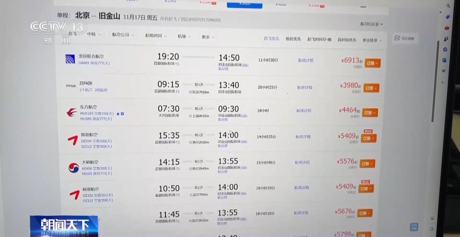 旅客:现在这个价格水平实际上跟我们前几年差不多了,我买了单程票到旧金山是5600多元,如果我是买双程票的话可能会更划算一点,算下来可能单程在4000多元。