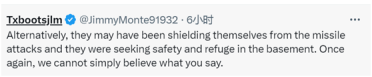也有人推测,“或者,他们可能是为了躲避导弹袭击,在地下室寻求安全和避难。再说一次,我们不能简单地相信你说的话。”