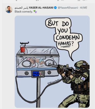 还有人借一幅以色列士兵瞄准保温箱里婴儿的漫画讽刺称,这是“黑色幽默。”