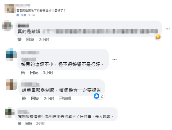 黄姓警察拍摄的不雅视频引发岛内网民不满。有网民质问道,“看看民进党治下的警察变成什么样了?”有网民批,“真的是离谱”“(台湾)警界的垃圾不少,怪不得(台湾)警誉不是很好”“请尊重那身制服”。还有网民毫不客气地说,“穿(警察)制服搞这些行为,相信出去也成不了任何事,丢人现眼”。