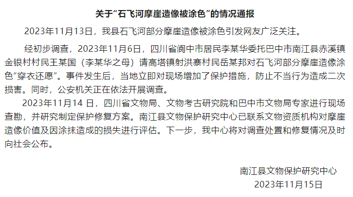 经初步调查,2023年11月6日,四川省阆中市居民李某华委托巴中市南江县赤溪镇金银村村民王某国(李某华之母)请高塔镇射洪寨村民岳某邦对石飞河部分摩崖造像涂色“穿衣还愿”。事件发生后,当地立即对现场增加了保护措施,防止不当行为造成二次损害。同时,公安机关正在依法开展调查。