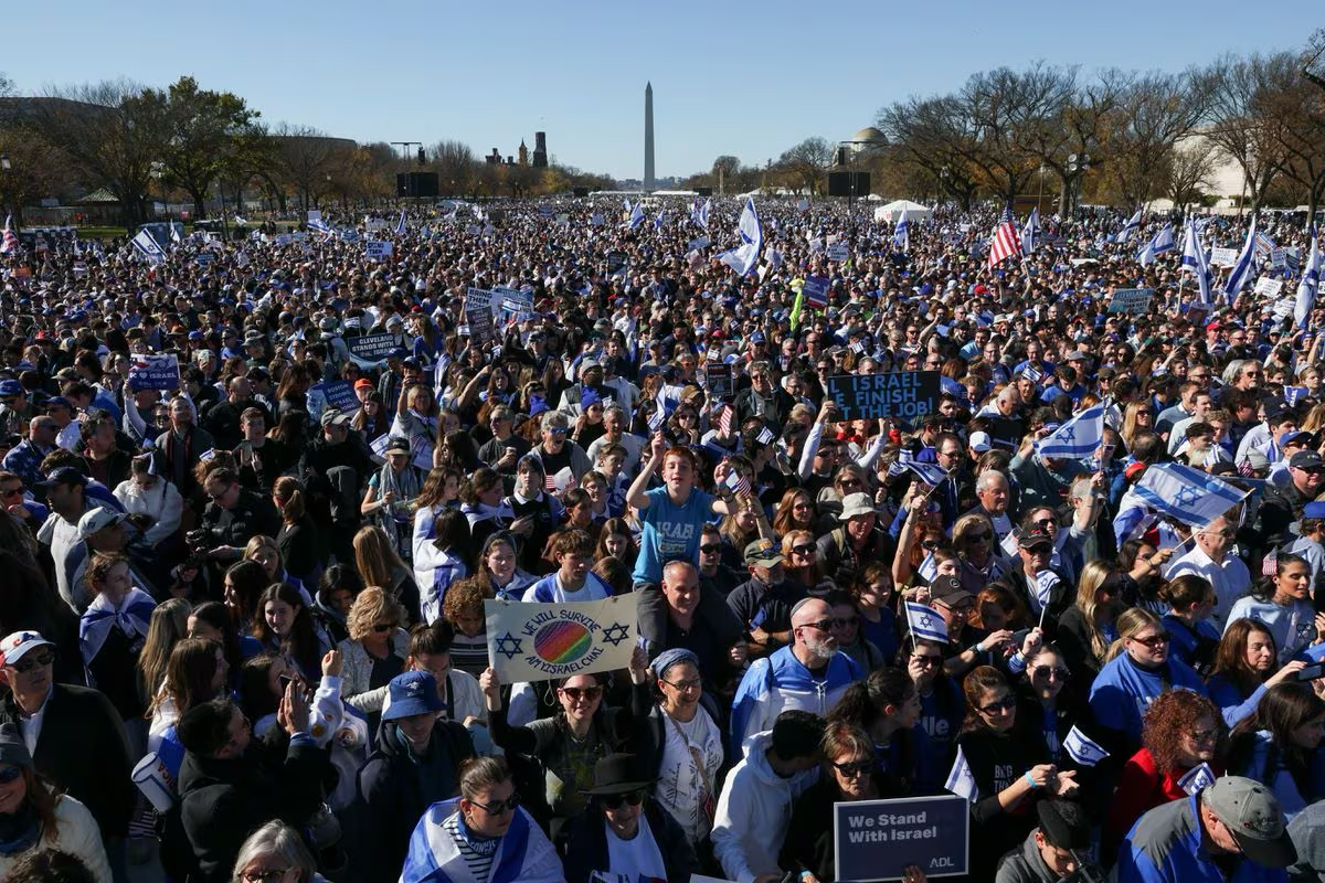 报道称,作为加强安保的措施,华盛顿市中心多个地区的街道被关闭,抗议者们聚集在华盛顿国家广场,许多人身披以色列和美国国旗。示威活动组织者说,他们估计有20万人参加了这次活动,以表明“美国对以色列的支持”,抗议活动呼吁释放被扣押的人质,并谴责“反犹太主义暴力和骚扰行为”等。