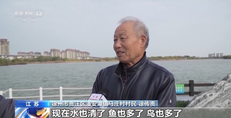 江苏省徐州市贾汪区潘安湖镇马庄村村民 徐传贵:现在水也清了,鱼也多了,鸟也多了。吸引了很多的游客都上这来参观旅游。
