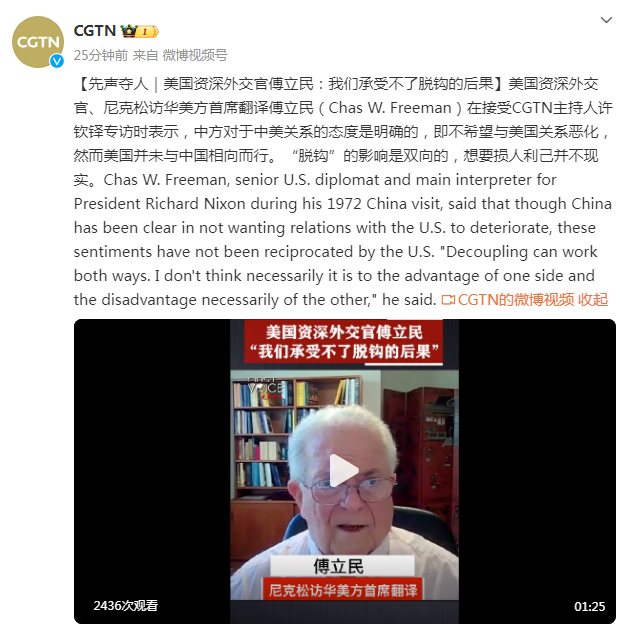 美国资深外交官、尼克松访华美方首席翻译傅立民(Chas W. Freeman)在接受CGTN主持人许钦铎专访时表示,中方对于中美关系的态度是明确的,即不希望与美国关系恶化,然而美国并未与中国相向而行。“脱钩”的影响是双向的,想要损人利己并不现实。