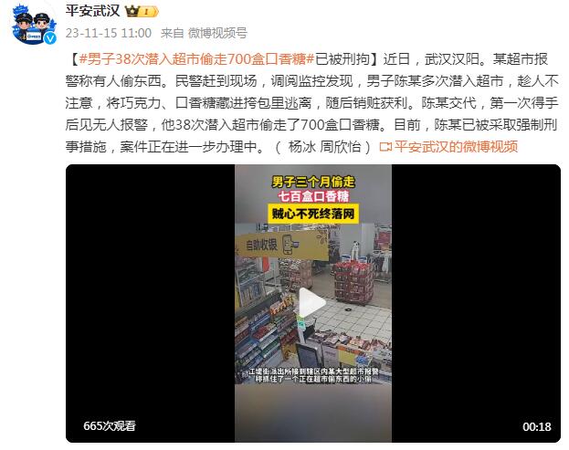 近日,武汉汉阳。某超市报警称有人偷东西。民警赶到现场,调阅监控发现,男子陈某多次潜入超市,趁人不注意,将巧克力、口香糖藏进挎包里逃离,随后销赃获利。陈某交代,第一次得手后见无人报警,他38次潜入超市偷走了700盒口香糖。目前,陈某已被采取强制刑事措施,案件正在进一步办理中。( 杨冰 周欣怡)