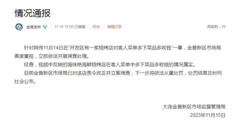 针对网传11月14日在“开发区有一家烧烤店对客人菜单多下菜品多收钱”一事,金普新区市场局高度重视,立即依法开展调查处理。