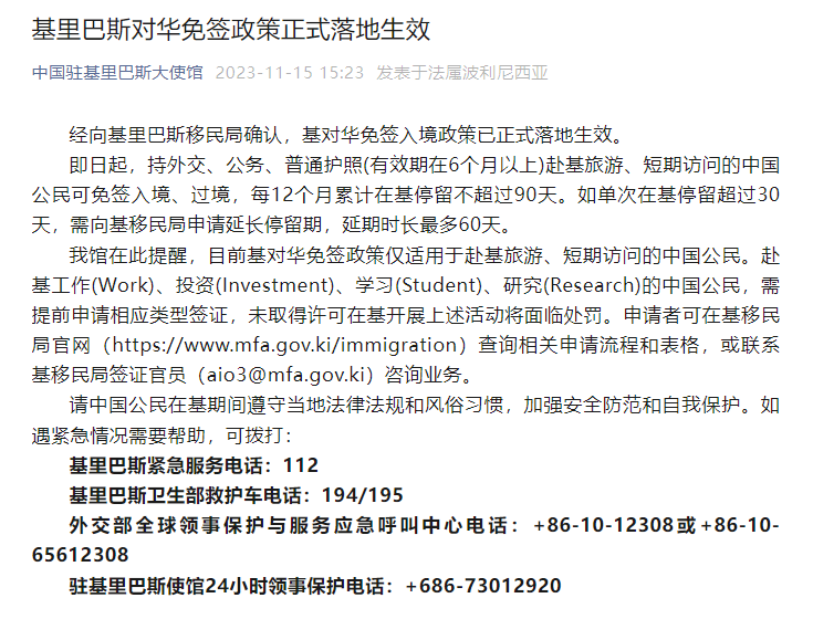 经向基里巴斯移民局确认,基对华免签入境政策已正式落地生效。