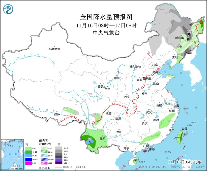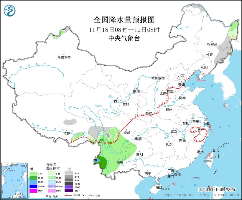 11月18日08时至19日08时,黑龙江东部和西北部、吉林东部、新疆北疆北部、西藏东部和北部、川西高原南部等地部分地区有小到中雪或雨夹雪。西藏东南部、四川南部、云南等地部分地区有小到中雨,其中,云南西南部等地部分地区有大雨(25~30毫米)(见图7)。