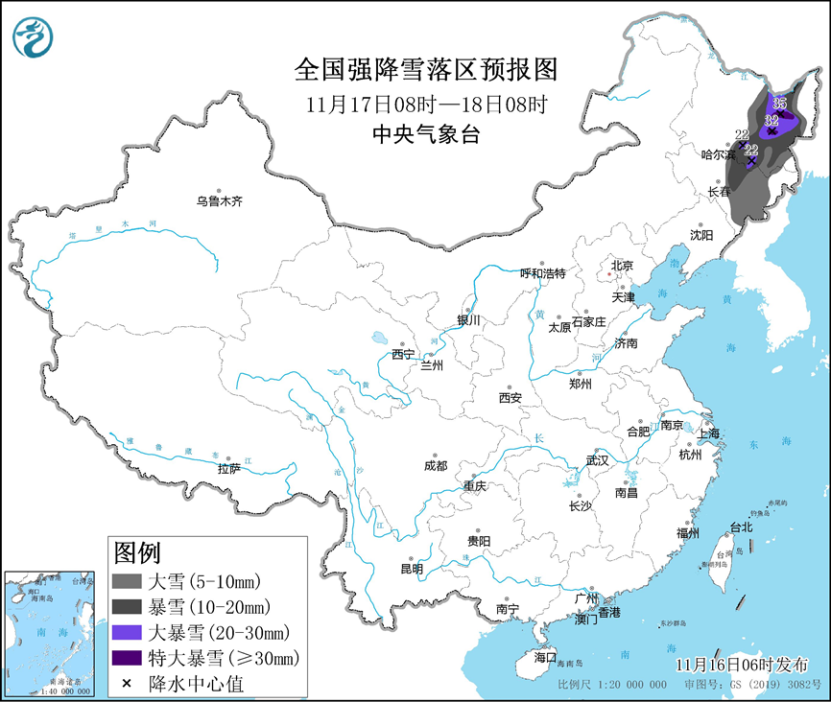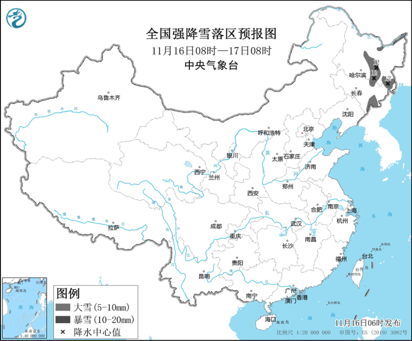 11月16日至17日,内蒙古中东部、东北地区等地将有一次雨雪天气过程。其中,11月16日08时至11月17日08时,黑龙江中东部、吉林东部等地部分地区有大雪,其中,黑龙江东部局地有暴雪(10~12毫米)。上述部分地区新增积雪深度3~5厘米,局地可达7厘米以上。11月17日08时至18日08时,黑龙江中东部、吉林中东部等地部分地区有大到暴雪,黑龙江东部部分地区有大暴雪,局地特大暴雪(30~35毫米),上述部分地区新增积雪深度8~15厘米,局地18厘米以上。中央气象台11月16日06时发布暴雪橙色预警(见图3、图4)。