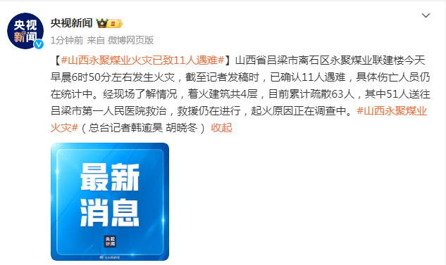 山西省吕梁市离石区永聚煤业联建楼今天早晨6时50分左右发生火灾,截至记者发稿时,已确认11人遇难,具体伤亡人员仍在统计中。经现场了解情况,着火建筑共4层,目前累计疏散63人,其中51人送往吕梁市第一人民医院救治,救援仍在进行,起火原因正在调查中。(总台记者韩逾昊 胡晓冬)