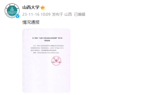 情况通报关于网传“山西大学洗衣机内有排泄物”事件的情况通报近日,网络上出现我校某学生公寓盥洗室公用洗衣机内有排泄物的信息。学校高度重视,已于第一时间成立工作小组进行调查核实,并将根据调查结果依规处理。感谢广大网友长期以来对山西大学的关心关注。