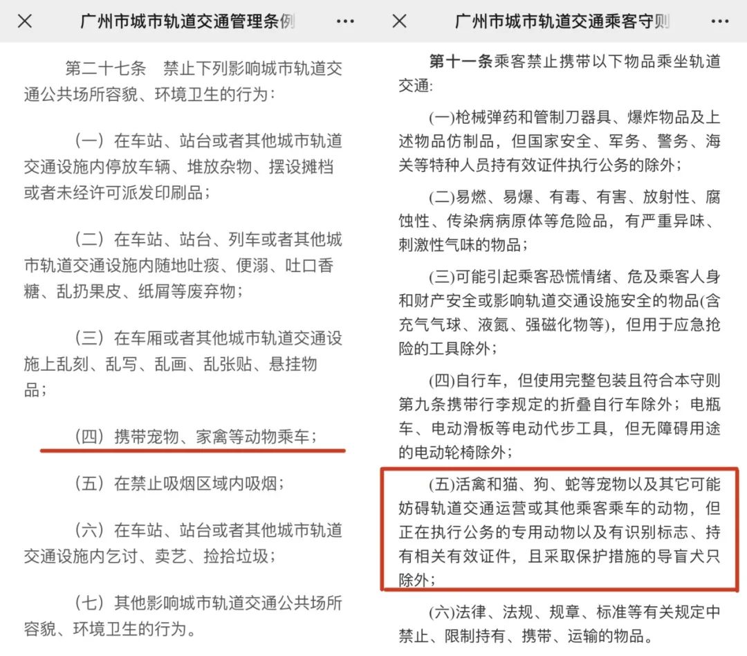经核查,此行为已违反《广州市城市轨道交通管理条例》第二十七条第四项“禁止携带宠物、家禽等动物乘车”的规定,过程中未影响正常的运营组织,警方对当事人进行了批评教育,并由广州地铁根据相关规定处以50元罚款。 当事人认识到其行为的危害性,接受罚款并就此造成的不良影响致歉。