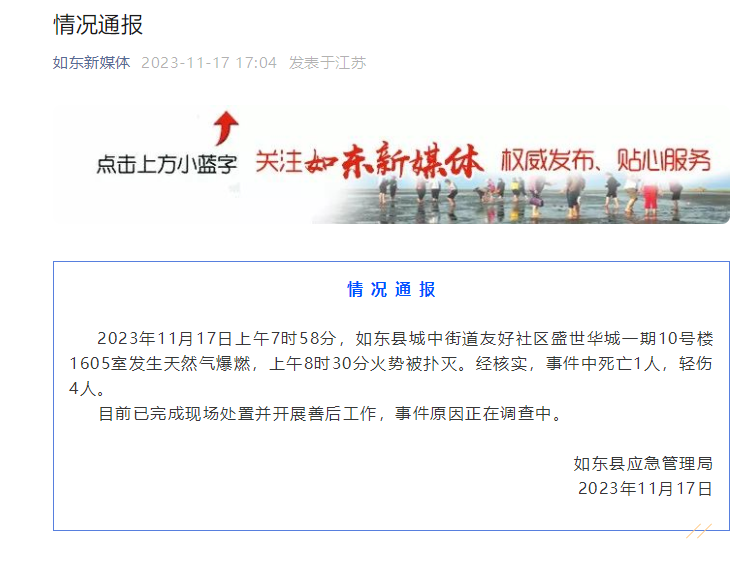 2023年11月17日上午7时58分,如东县城中街道友好社区盛世华城一期10号楼1605室发生天然气爆燃,上午8时30分火势被扑灭。经核实,事件中死亡1人,轻伤4人。