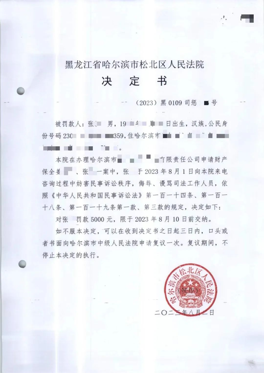 对于这种肆意辱骂法院干警、挑衅司法权威的恶劣行为,法官充分考虑案件实际情况与张某的行为性质,依法决定对张某罚款5000元。收到处罚决定书后,张某立即向上级法院提出复议申请,并一改之前的嚣张态度,完全否认自己曾在通话中有过辱骂法官和助理的行为,妄图逃避处罚。可张某显然忘记了之前法官对他的提醒,法院是国家司法机关,每个人在法院的诉讼行为都将被完整记录,张某在电话中辱骂法官和助理的一字一句早已被清晰的记录在通话录音中。鉴于事实清楚、证据充分,上级法院驳回了张某的复议申请,维持了松北区人民法院的处罚决定。在法律的威慑和无可辩驳的事实面前,张某最终认识到了自己的错误,主动联系执行法官和助理表达了歉意并全数缴纳了罚款。