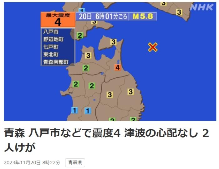 中新网11月20日电 据日本放送协会(NHK)报道,当地时间20日6时,日本青森县近海发生5.8级地震,震源深度50千米。