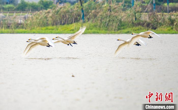多只小天鹅在季家湖上展翅翱翔。董晓斌 摄