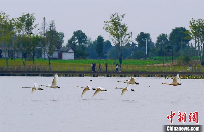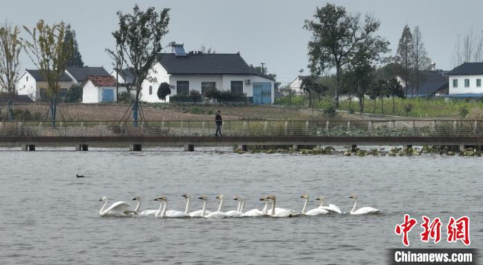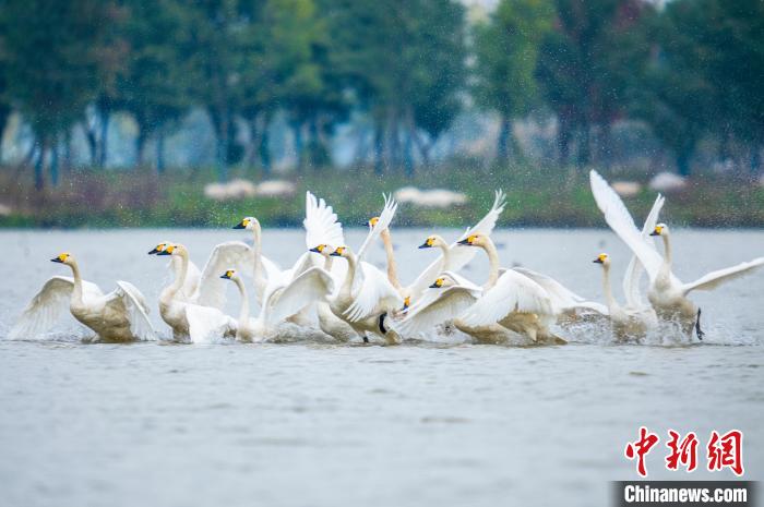 11月18日,在湖北省当阳市季家湖湿地公园,一群小天鹅在湖面上演“水上芭蕾”。小天鹅是国家二级重点保护动物,主要生活在北欧以及西伯利亚苔原地带,每年10月开始南飞越冬,喜欢水质良好、水域开阔、水生植物丰富并有浅滩的环境。近年来,经过治理的季家湖生态环境越来越好,吸引小天鹅等众多候鸟连续多年来此越冬。