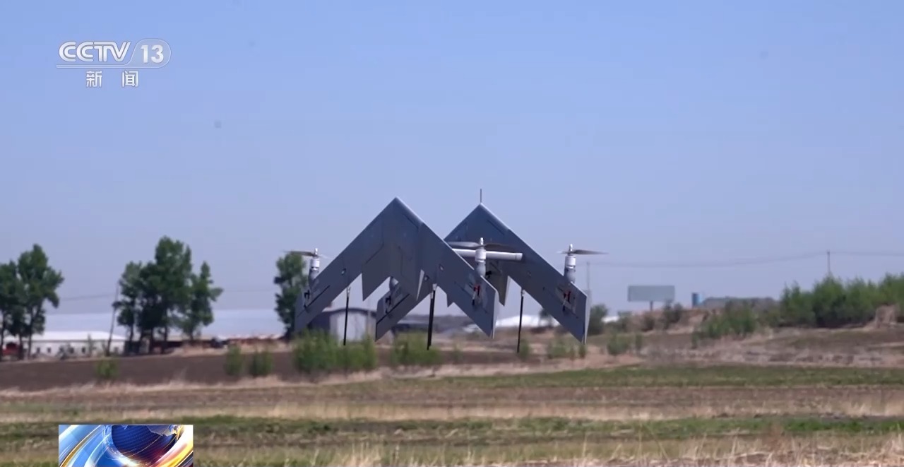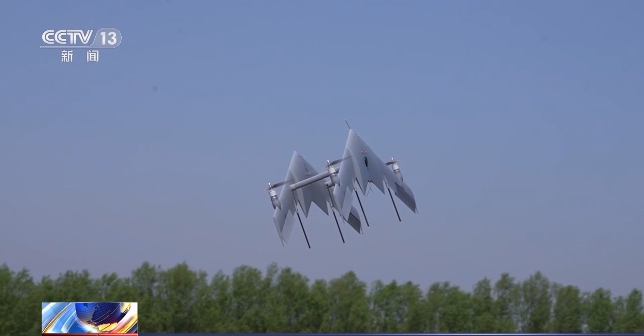 总台央视记者 褚尔嘉:现在在我面前这里就是一款全新的无人机类型,我们可以看到它由两个固定的飞翼组成,它也是目前全球首创的一个双飞翼垂直起降固定翼无人机。这款无人机它是可以实现竖直状态下的一个垂直起降,起飞后,它又可以实现一个正常的平飞。