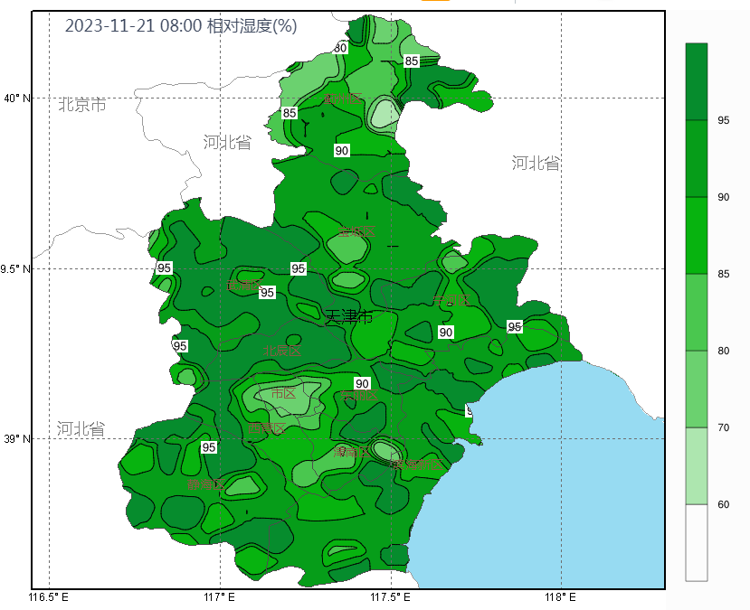 21日凌晨至早间区域北部地区逐渐转为弱北风,辐合风场维持,我市大部分地区相对湿度明显增加达到90%以上,大气扩散条件持续不利,空气质量达中度污染。