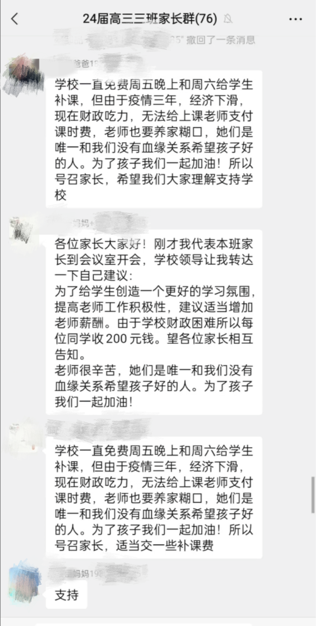 网传截图显示,名称为“24届高三三班家长群”的聊天群共有成员76人,其中一位群昵称为某某爸爸的家长发布消息:“今天我代表本班家长到会议室开会,学校领导让我转达一下自己建议:为了给学生创造一个更好的学习氛围,提高老师工作积极性,建议适当增加老师薪酬。由于学校财政困难所以每位同学收200元。望各位家长相互告知。”“学校一直免费周五晚上和周六给学生补课……现在财政吃力,无法给上课老师支付课时费,老师也要养家糊口,她们是唯一和我们没有血缘关系希望孩子好的人……所以号召家长,希望我们大家理解支持学校。”