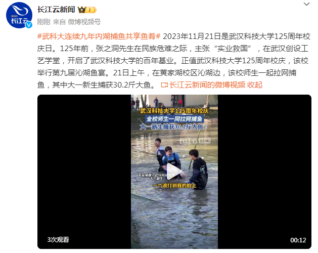 2023年11月21日是武汉科技大学125周年校庆日。125年前,张之洞先生在民族危难之际,主张“实业救国”,在武汉创设工艺学堂,开启了武汉科技大学的百年基业。正值武汉科技大学125周年校庆,该校举行第九届沁湖鱼宴。21日上午,在黄家湖校区沁湖边,该校师生一起拉网捕鱼,其中大一新生捕获30.2斤大鱼。
