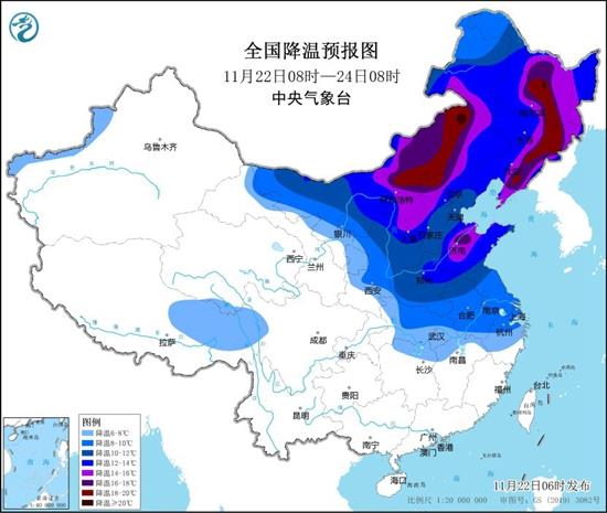 今起三天(11月22日至24日)寒潮继续向东扩展,迎来大风、降温影响核心时段,长江中下游及以北地区气温将先后下降6~10℃,内蒙古中东部、东北地区东部等地部分地区降温幅度可超过16℃。今天迎来小雪节气,东北降雪将再度增多、加强,黑龙江中部偏南地区局地有大暴雪。