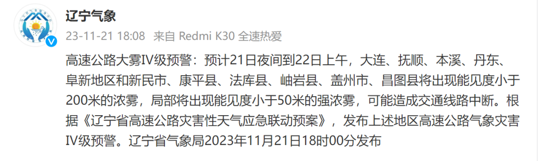 辽宁省气象台发布大雾预警