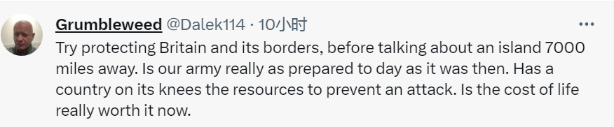 “在谈论7000英里外的岛屿之前,先试着保护英国及其边界。今天我们的军队真的像当时那样做好了准备吗?一个陷入困境的国家是否有足够的资源来防止袭击。现在付出生命的代价真的值得吗。”