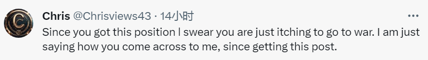 “自从你得到这个职位,我发誓你就是渴望打仗。我只是在描述,自从你得到这个职位后你给我的印象。”