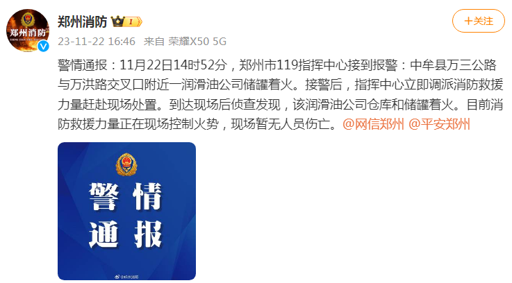 警情通报:11月22日14时52分,郑州市119指挥中心接到报警:中牟县万三公路与万洪路交叉口附近一润滑油公司储罐着火。接警后,指挥中心立即调派消防救援力量赶赴现场处置。到达现场后侦查发现,该润滑油公司仓库和储罐着火。目前消防救援力量正在现场控制火势,现场暂无人员伤亡。