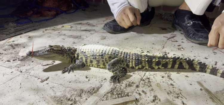 “这条鳄鱼大约有一岁,现在非常害怕,瞳孔变得很大。”该抓捕工作人员说,他通过手电筒发现了鳄鱼亮晶晶的眼睛,下水后就立即抓到了这条鳄鱼。