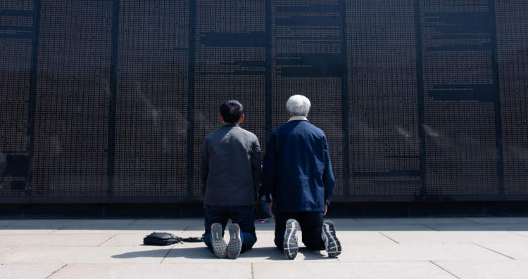 看到父亲金用善烈士的名字补刻在英名墙上后,白发苍苍的金伍星、金云星兄弟俩长跪不起,泣不成声。